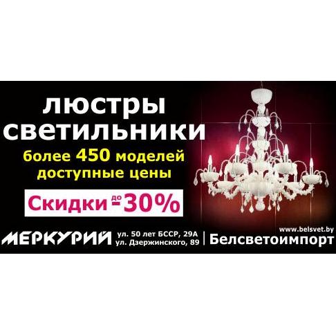 Уважаемые покупатели! С 23 марта 2017 года в сети магазинов "Меркурий-Борисов" проходит акция «Светильники до -30%». В рамках данной акции все покупатели (физические лица) могут приобрести акционные светильники компании "Белсветоимпорт" за наличный расчет со скидкой до -30%.